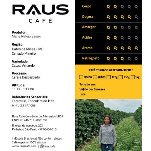 Sensorial: Caramelo, chocolate ao leite e frutas cítricas Variedade: Catuaí Amarelo Região: Cerrado Mineiro Produtor: Marie Nakao Sasaki