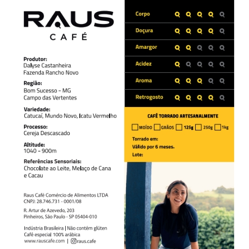 Sensorial: Chocolate ao leite, melaço de cana e cacau Variedade: Catucaí, Mundo Novo, Icatu Vermelho Produtor: Campo das Vertentes Região: Dalyse Castanheira