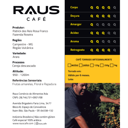 Sensorial: Floral, frutas amarelas e rapadura Variedade: Arara Produtor: Patrick dos Reis Região: Campestre – MG